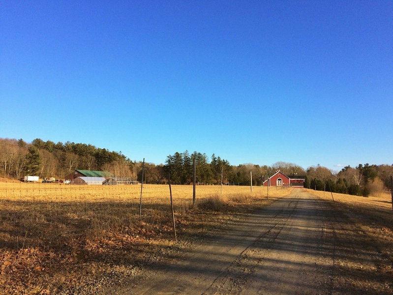 Image description: the view up a long dirt road leading up to a big, old, red barn. To the left of the dirt road are dry fields with greenhouses and another barn in the distance. A line of coniferous and bare deciduous trees wraps behind the barns and greenhouses. The cloudless sky is an exceptionally clear blue on a sunny winter-almost-spring afternoon.